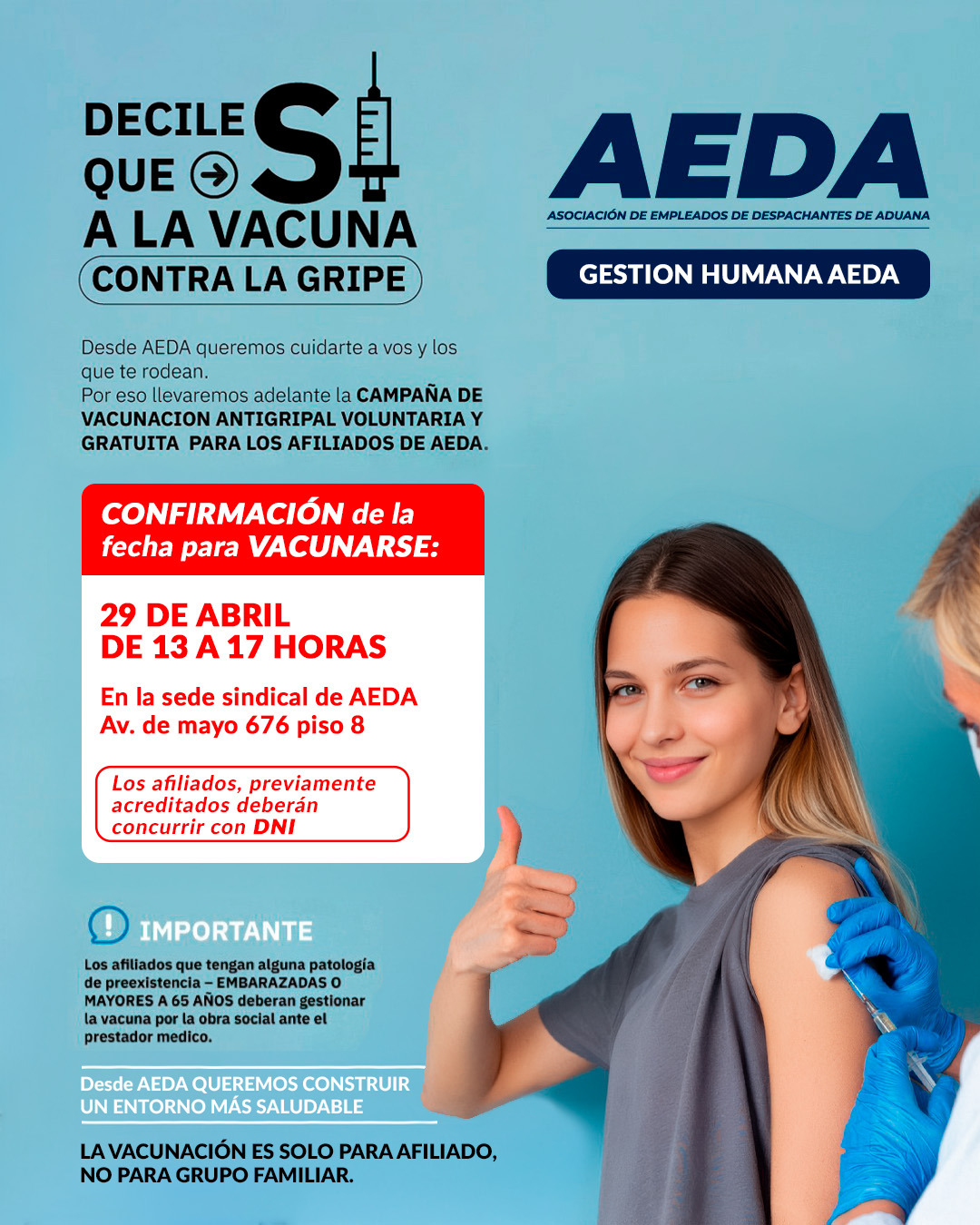 Debido al interés común desde AEDA comunicamos que el 29 de abril se llevará adelante una nueva jornada de vacunación contra la gripe, exclusiva para afiliados y afiliadas.