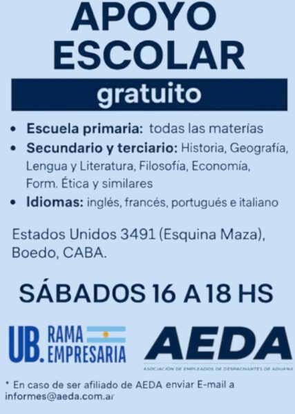 Desde AEDA y U.B Miguel Miranda Rama Empresaria acompañamos a nuestras familias con un espacio de apoyo escolar totalmente gratuito, pensado para reforzar contenidos y acompañar trayectorias educativas en todos los niveles.