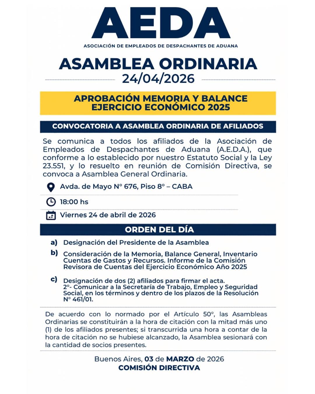 Se comunica a todos los afiliados de la Asociación de Empleados de Despachantes de Aduana (A.E.D.A.), que conforme a lo establecido por nuestro Estatuto Social y la Ley 23.551, y lo resuelto en reunión de Comisión Directiva, se convoca a Asamblea General Ordinaria.