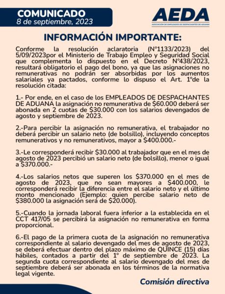 Conforme la resolución aclaratoria (Nº1133/2023) del 5/09/2023por el Ministerio de Trabajo Empleo y Seguridad Social que complementa lo dispuesto en el Decreto Nº438/2023, resultará obligatorio