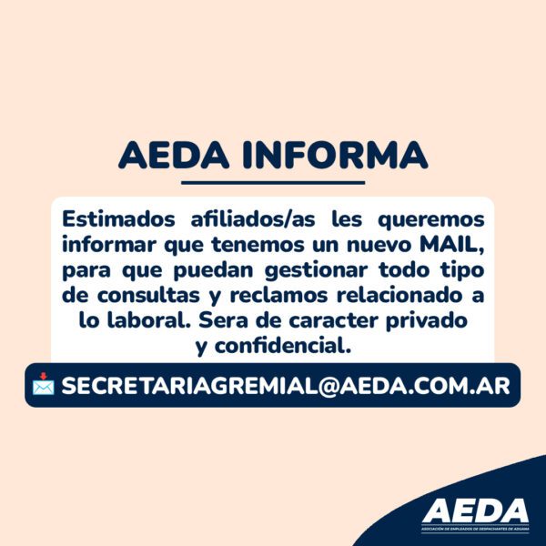 ¡Estimados afiliados/as! Tenemos un nuevo MAIL para que puedan gestionar consultas y reclamos laborales de manera privada y confidencial. ¡No duden en contactarnos! MAIL: secretariagremial@aeda.com.ar