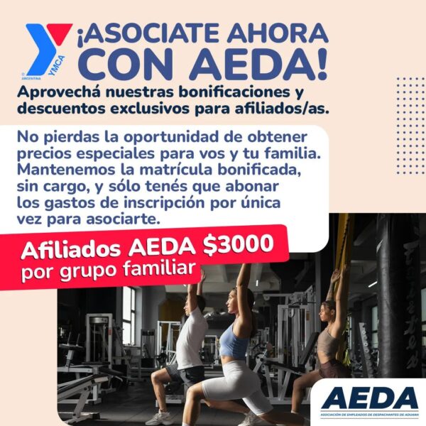 Asociate ahora con AEDA en conjunto con YMCA Argentina Y aprovechá las bonificaciones y descuentos exclusivos para afiliados/as qué ofrecemos. Afiliados $3000 por grupo familiar.