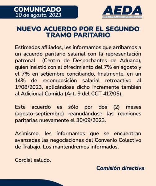 Estimados afiliados, les informamos que arribamos a un acuerdo paritario salarial con la representación patronal (Centro de Despachantes de Aduana), quien insistió con el ofrecimiento