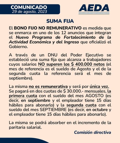 El BONO FIJO NO REMUNERATIVO es medida que se enmarca en uno de los 12 anuncios que integran el Nuevo Programa de Fortalecimiento de la