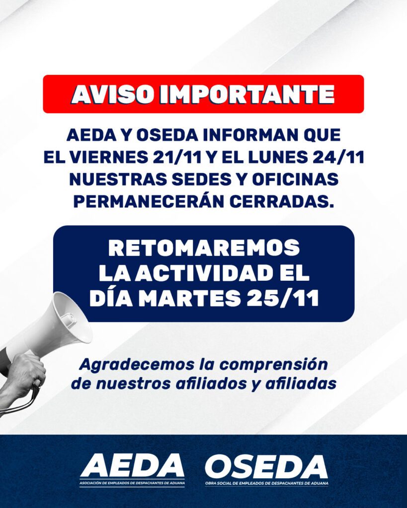 Dada la importancia de la situación, el Consejo Directivo de OSEDA y la Comisión Directiva de AEDA invitan a todos sus afiliados a participar de dos reuniones semanales los días martes y jueves del mes de abril, que se desarrollaran en el horario de 18 a 19:30 hs en nuestra sede de Av de Mayo 676 piso 8, para ampliar la información y poder dar respuesta a todas sus dudas.